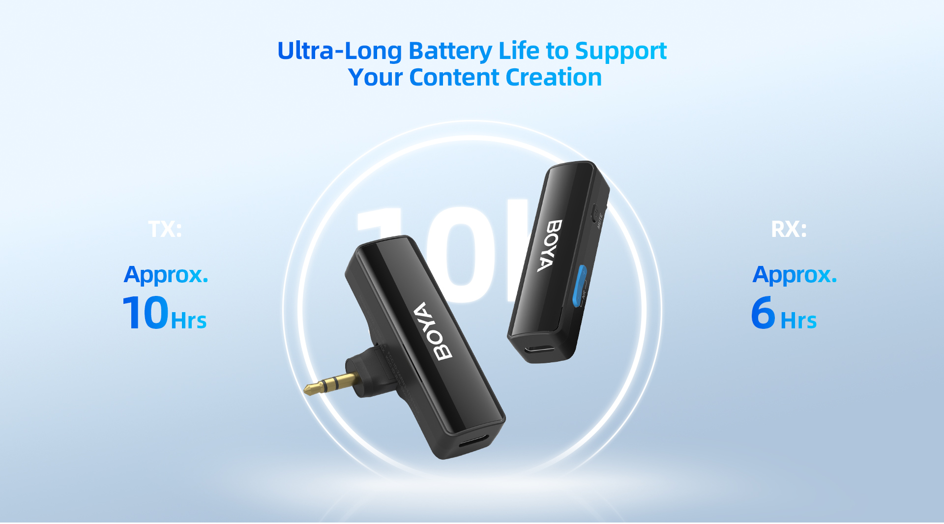 - The transmitter units feature built-in 95mAh batteries with a 10-hour runtime, while the receiver features a 120mAh battery with a 6-hour runtime.