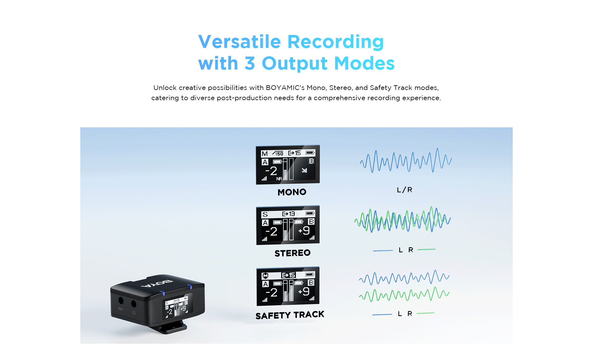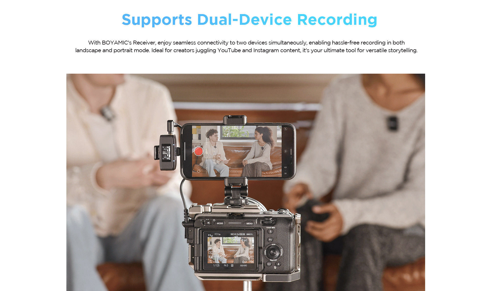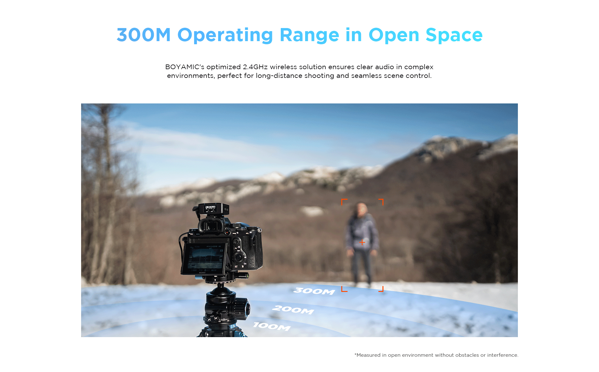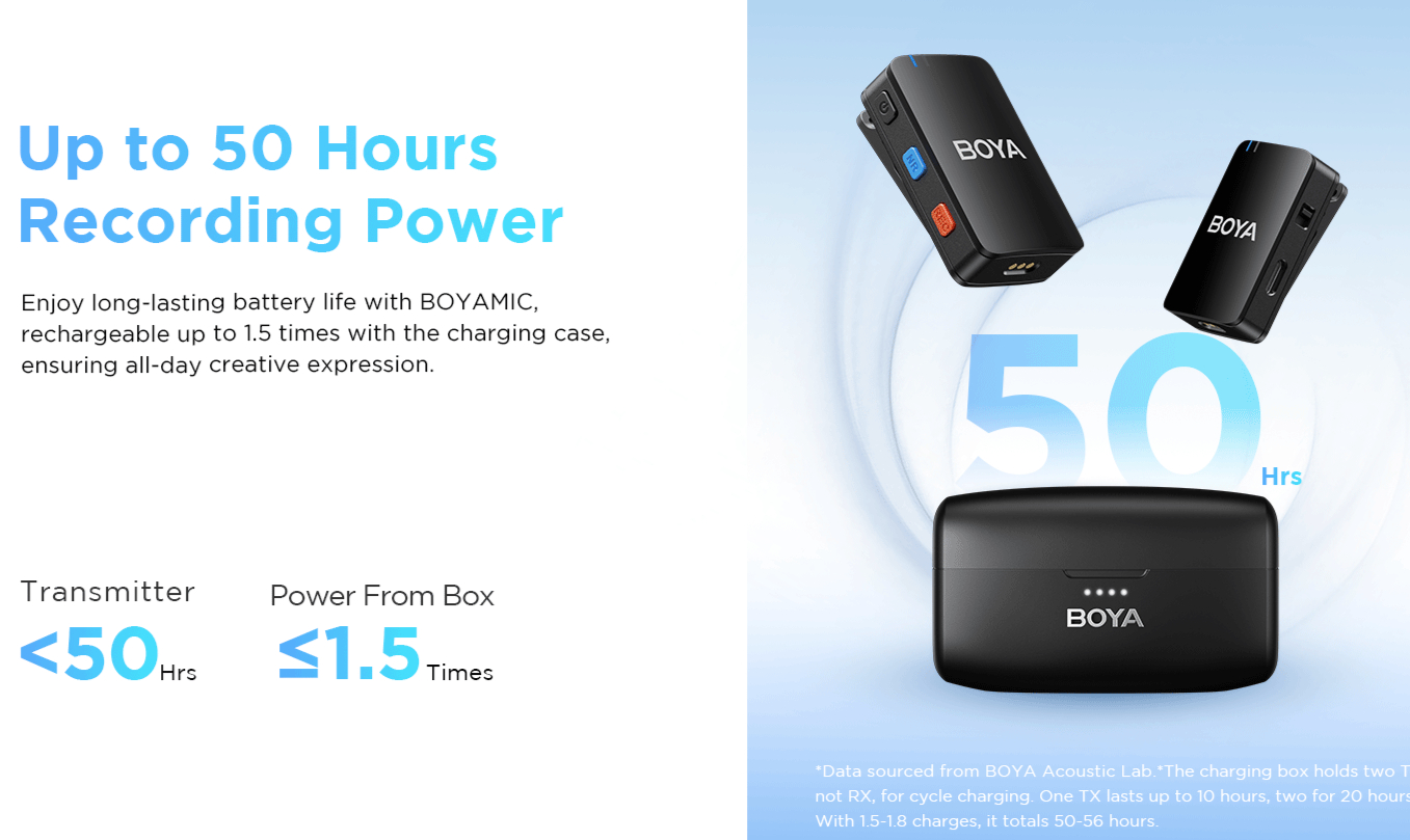 All the components of the BOYAMIC system can communicate to one another from up to 984.3′ away via line-of-sight 2.4 GHz technology. This means the BOYAMIC thrives in long-distance recording environments.