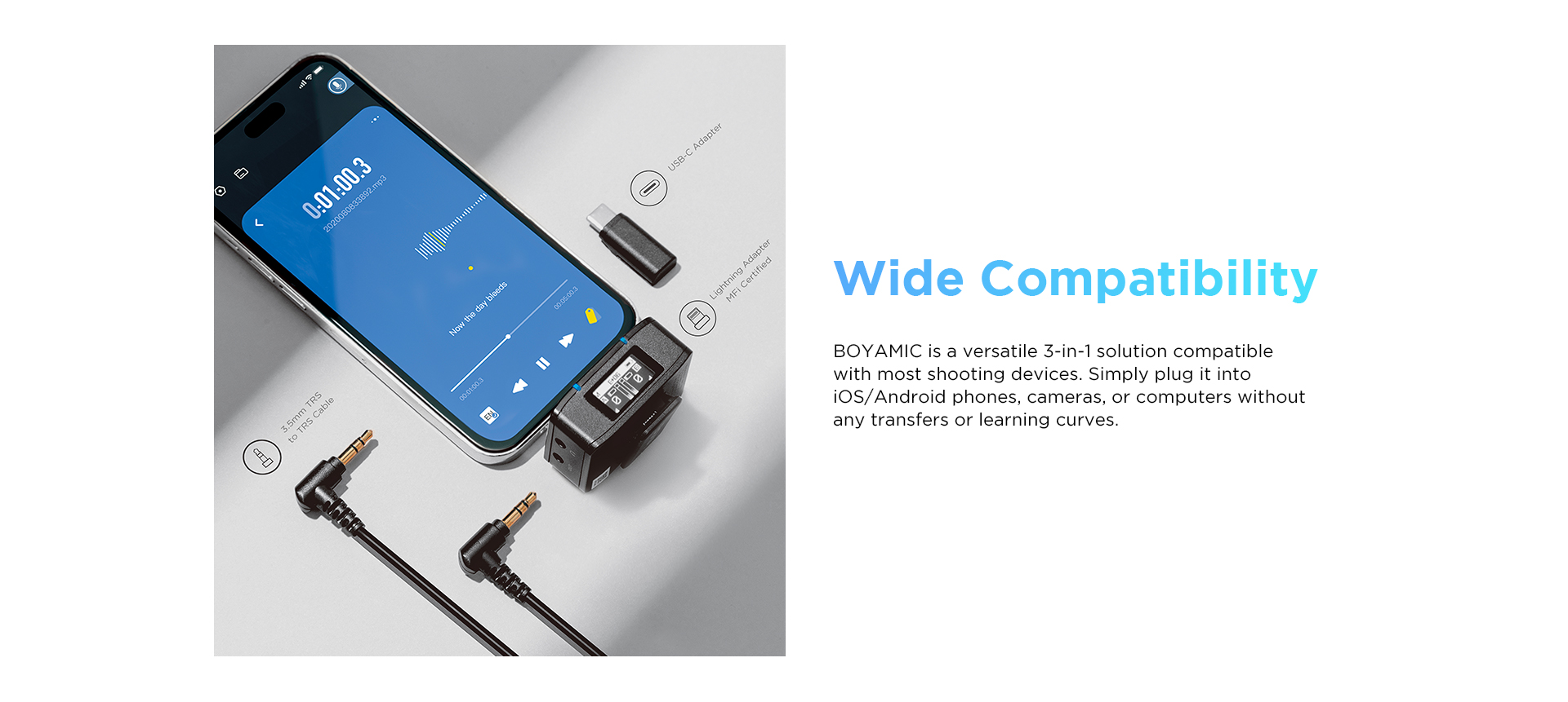 The receiver features interchangeable adapters that allow you to plug it directly into your USB-C or Lightning mobile device. A 3.5mm TRS output can also connect to a compatible camera for simultaneous recording to two devices. Output audio in mono, stereo, or safety track modes depending on the needs of your production. All of your system settings can be controlled using the onboard buttons and OLED screen. The integrated clip doubles as a mount by sliding into your camera’s cold shoe slot. Monitor your audio signal using the headphone port.