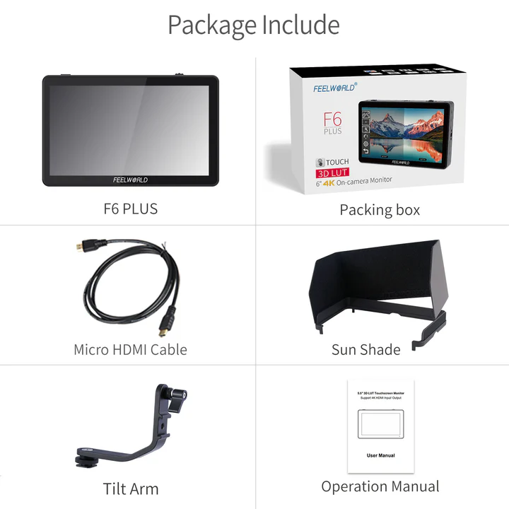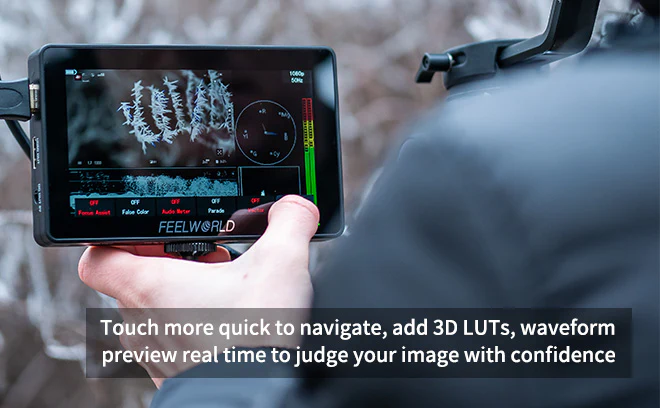 【Easy Touchscreen Controls】FEELWORLD F6 PLUS features 1080p resolution, touchscreen control, HDMI input and output, a SD slot to load 3D LUTs, and supports up to UHD 4K input.