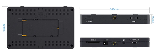 Specifications Display Spec. Screen Size: 6" Touch Screen Resolution: 1920×1080 pixels  Pixel Pitch: 0.0639 (H) x 0.0213 (W) mm  Aspect Ratio: 16:9  Brightness: 500cd/m²  Contrast Ratio: 1000:1 Viewing Angle: 80°/80°(L/R) 80°/80°(U/D) Input/ Output Input: 1 X 4K HDMI,  1 X Type-C Output: 1X 4K HDMI, DC Output  Audio:  3.5mm Stereo Headphone HDMI Input/ Output Support Format: 480i/576i/480p/576p; 1080i (60/59.94/50); 720p (60/59.94/50/30/29/25/24/23.98); 1080p (60/59.94/50/30/29.97/25/24/24sF/23.98/ 23.98sF); 4K UHD 3840×2160p (30/29.97/25/24/23.98Hz), 4096×2160p (24Hz) General Input Voltage: DC7~24V Consumption: ≤9W Connector: DC  Working Temperature: -20°C~55°C Storage Temperature: -30°C~65°C  Install Way: ¼-20 thread points (top, bottom, right) Unit Size: 148Lx93Hx20D (mm) Unit Weight: 235g Compatible Battery: Sony F970, F960, F950, F930, F770, F750, F730, F570, F550, F530, QM91D, QM91, QM90D, QM90, QM71D, QM71, QM70D, QM70, QM51D, QM51, FM71, FM70 series. Canon LP-E6 (Note battery not include, need purchase sperate)