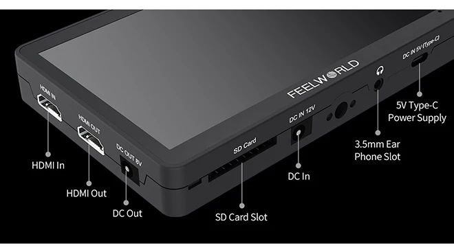 FEELWORLD F6 PLUS features standard 1/4″ mount points (top, bottom, right) for attaching it to cameras and rigs. Not only you can install it on a monitor through tilt arm, but also you can mount it on a handheld stabilizer or securely attach it to the top of your camera as the ultimate HD viewfinder! If you install it on the bottom of the device, you can also combine the image flip function to maintain the correct orientation of the screen!