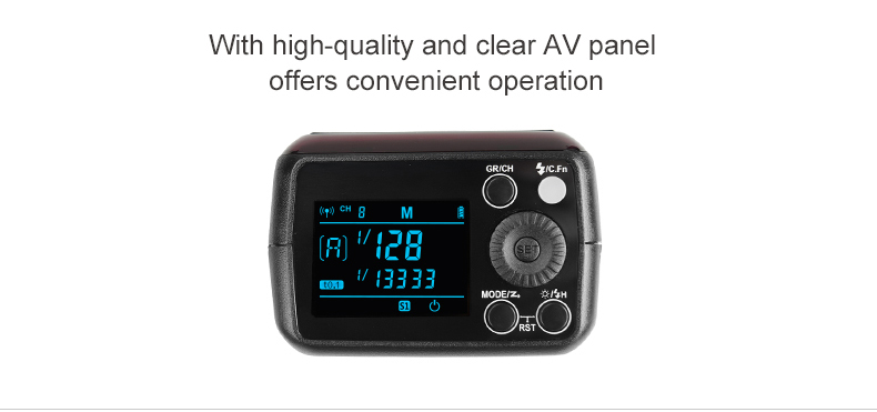 • Built-in wireless receiver: control triggering power level, alert beep with optional wireless transmitter. Compatible with Nikon, Canon, Sony, Olympus, Panasonic and Fuji TTL.