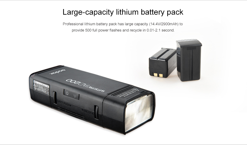 • Large Capacity Lithium Battery Pack : The 14.4 V / 2900 mAH battery pack gets 500 full power flashes with 0.01 to 2.1 sec. recycling.
