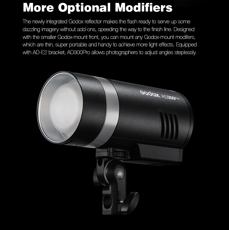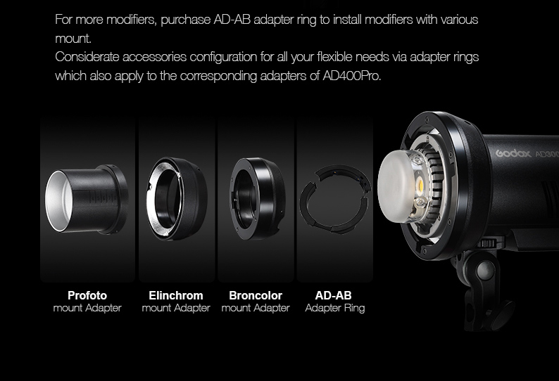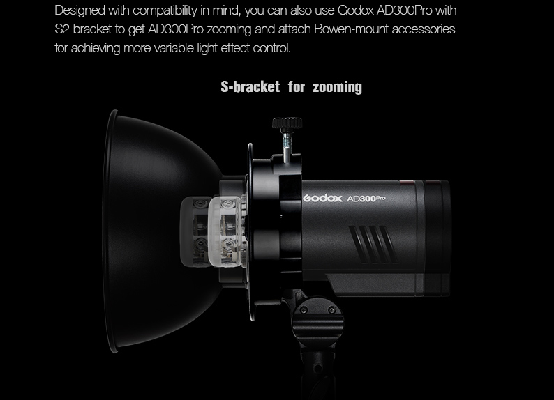The AD300 Pro fits all Strobepro and Bowens modifiers when used with the optional S2 bracketor direct AD300 Pro Bowens Mount.