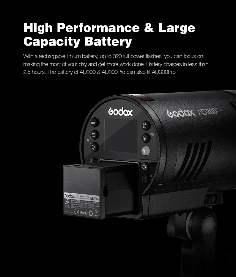 The AD300 Pro comes with an advanced lithium-ion battery that has been designed for performance, making it more reliable than ever when shooting on location. The battery is loaded into the underside of the unit to keep it super compact due to its small size, whilst still offering a recycle time of just 0.01-1.5s with up to approximately 320 full power flashes. The AD300 Pro is also compatible with the AD200 and AD200 Pro batteries.