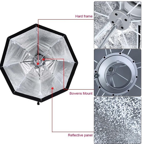 Compatible with all Godox flash heads with Bowens front accessory mounts, the 80 cm Portable Umbrella Octa Softbox with Bowens Adapter and Grid from Godox provides a soft, pleasing quality of light.