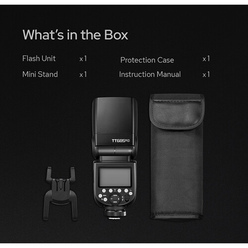 An integrated 2.4 GHz X radio system is incorporated into the TT685S for wireless triggering. Able to be set up as a master or slave, this flash will help you create a versatile lighting setup with a range of 328′ and support for 32 channels and four groups. Functions as a transmitter unit for the V1, AD200Pro, and AD300Pro flash systems. Also functions as a receiver unit for X1, X2, XPro, and V1 transmitter units.