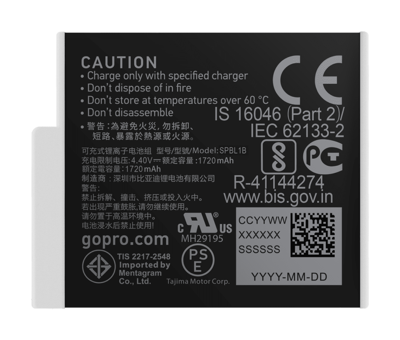- Advanced 1720mAh lithium-ion battery boosts camera performance over standard GoPro batteries across a wide temperature range.