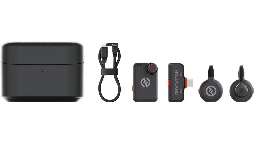 Record up to two people in mobile journalism or content creation applications using this LARK M2S Combo Wireless Microphone System from Hollyland. The system includes two ultracompact transmitters with built-in omnidirectional microphones for discreet recording, a USB-C plug-in receiver for direct connection with mobile devices, a camera-mount receiver, a USB-C to Lightning adapter cable, and a charging case. The transmitters feature a titanium clip-on design to attach securely to your talent and do not have visible logos for a low-profile appearance.