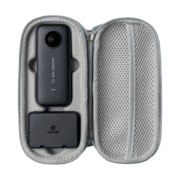 The Insta360 ONE X2 Carry Case is a compact fabric case with a zippered enclosure. It fits the ONE X2 camera in a dedicated slot and also features another slot and a zippered interior pocket for accessories.