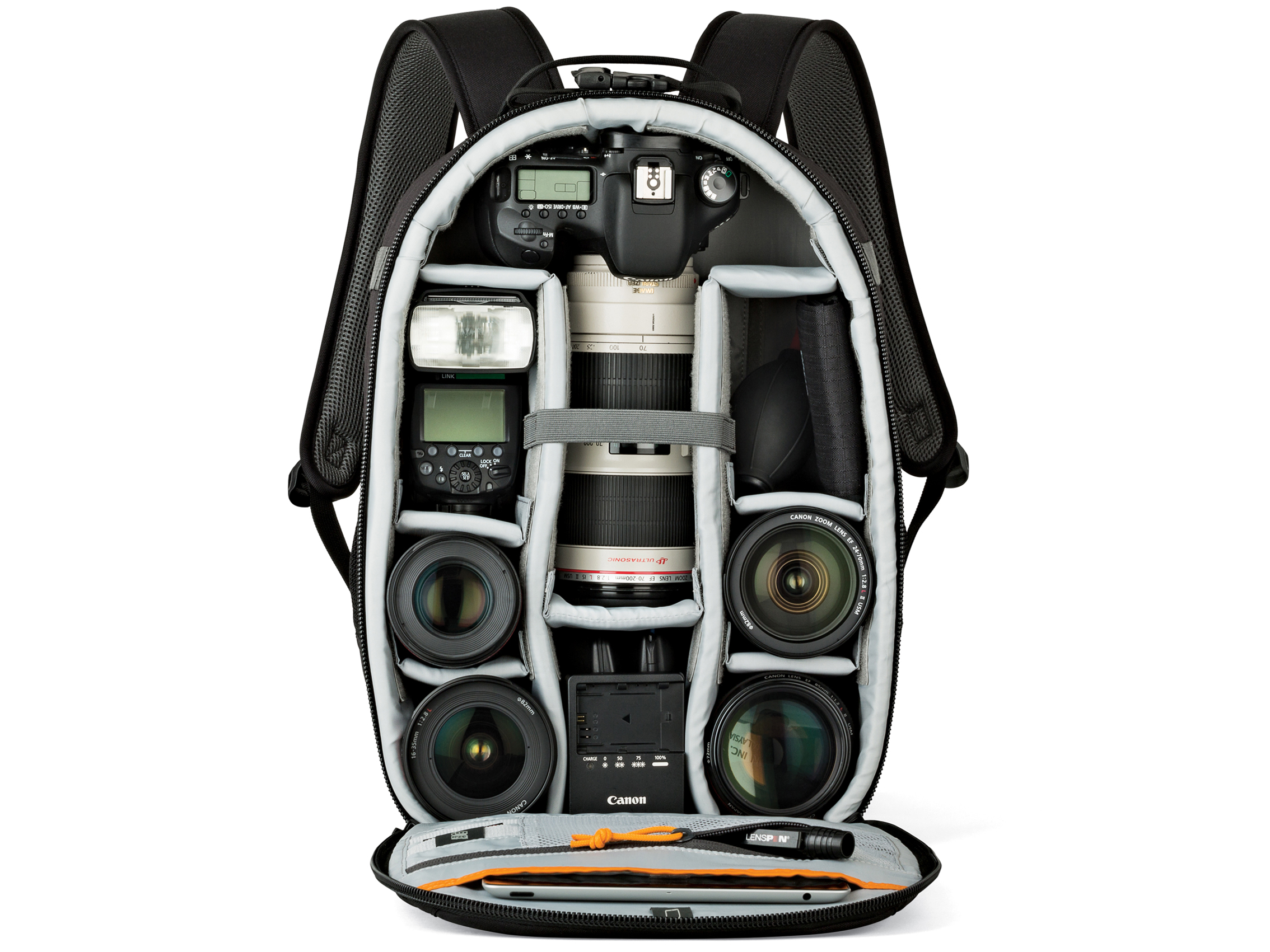 - Use the hidden tripod cup holder near the base of the pack to secure a tripod, monopod, or telescoping trekking poles