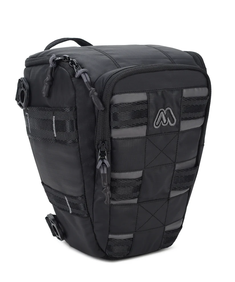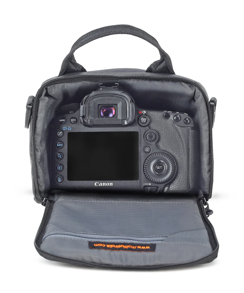 A modern, multi-equipment shoulder bag with quick access to camera and lens.