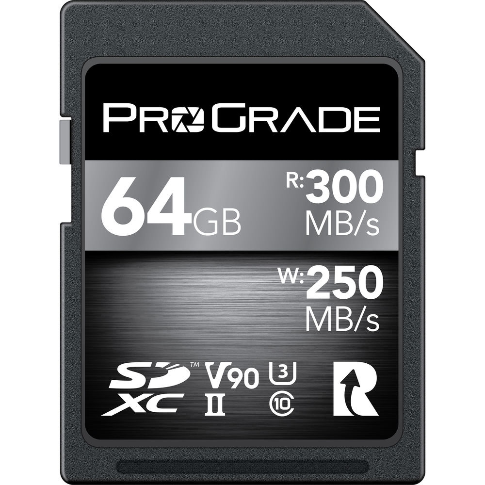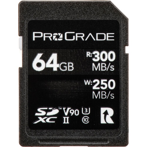 The 64GB UHS-II SDXC Memory Card from ProGrade Digital features a storage capacity of 64GB and takes advantage of the UHS-II bus to support maximum read speeds of 300 MB/s and maximum write speeds of 250 MB/s. This card has also been designed with the V90 Video Speed Class rating, which guarantees minimum write speeds of at least 90 MB/s, allowing the card to be used in DSLRs, mirrorless cameras, camcorders, and digital cinema cameras that produce rich data streams, including 6K, 5K, 4K, UHD 4K, and high bit rate MPEG-4 video. It is also well-suited for raw photos and rapid-fire bursts.