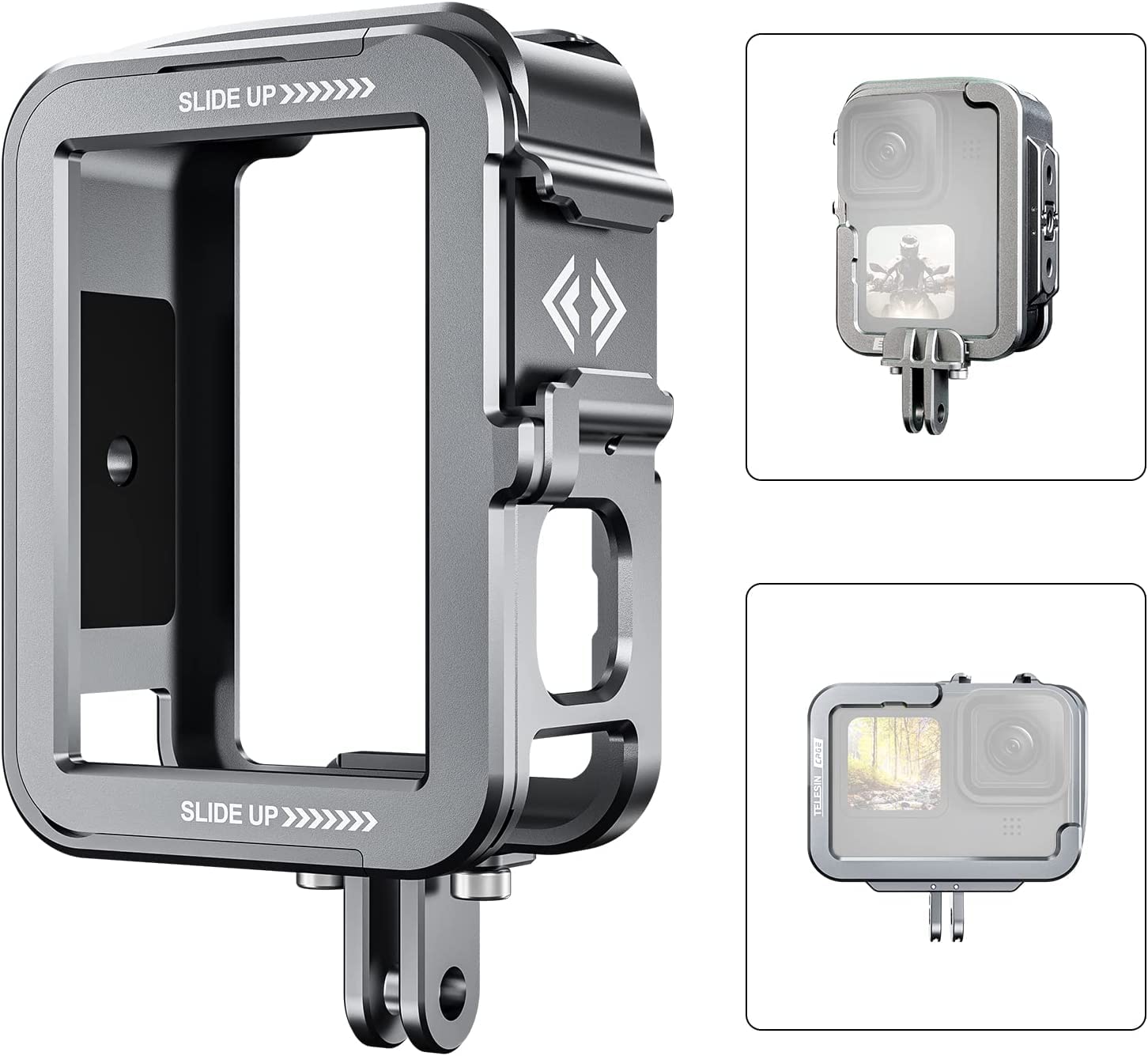 This multi-function camera case is made of lightweight aluminium alloy, hollow-carved design. It can protect your camera from normal damaging or caused by overheating, more durable than plastic skeleton housing case. The case is with clod shoe mount all-in-one design, more convenient to operate. You can mount a flash, video light, microphone on top of this case and more..