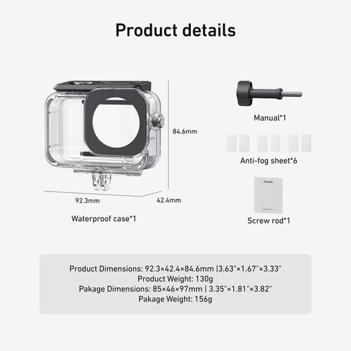 Take your DJI Osmo Action 6 snorkeling, surfing, or diving to depths of up to 197′ using this Waterproof Case from TELESIN. The environmentally friendly case features a PC plastic hard shell with stainless steel parts for drop and crush resistance. Six included antifog sheets ensure a crisp and clear view regardless of temperature differences. The bottom of the case features a 2-prong action camera mount with a locking thumbscrew.