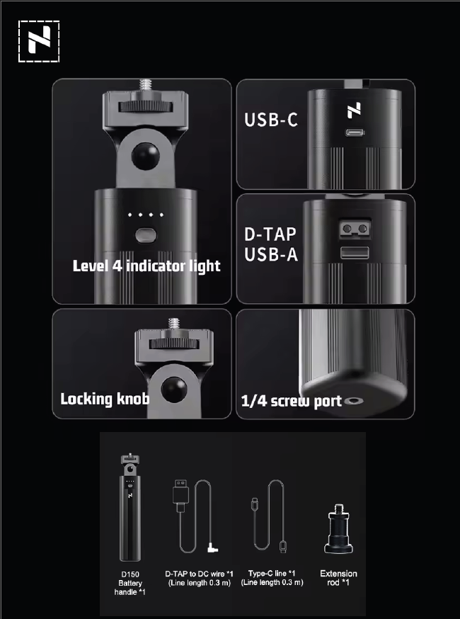 - The 27000MaH charging grip TBC-30 has a DC, D-TAP and a type-C output ports, allowing your device on top of it to be charged during production, which is also capable of charging two devices at the same time.