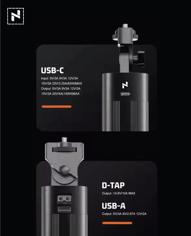 - Compatible with GODOX, NANLITE and other professional POCKET LIGHTS. Enough capacity of 27000mAh stored.