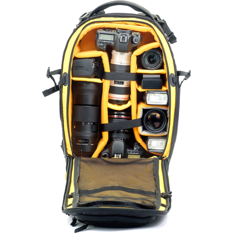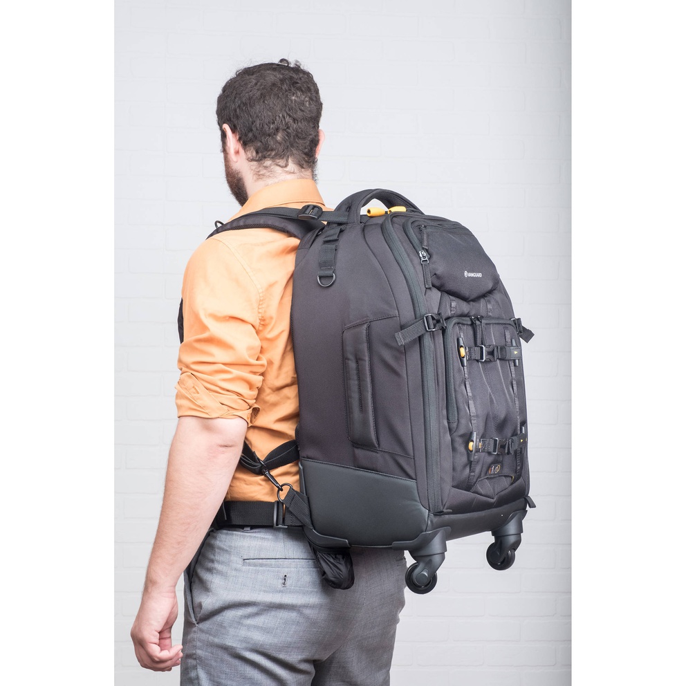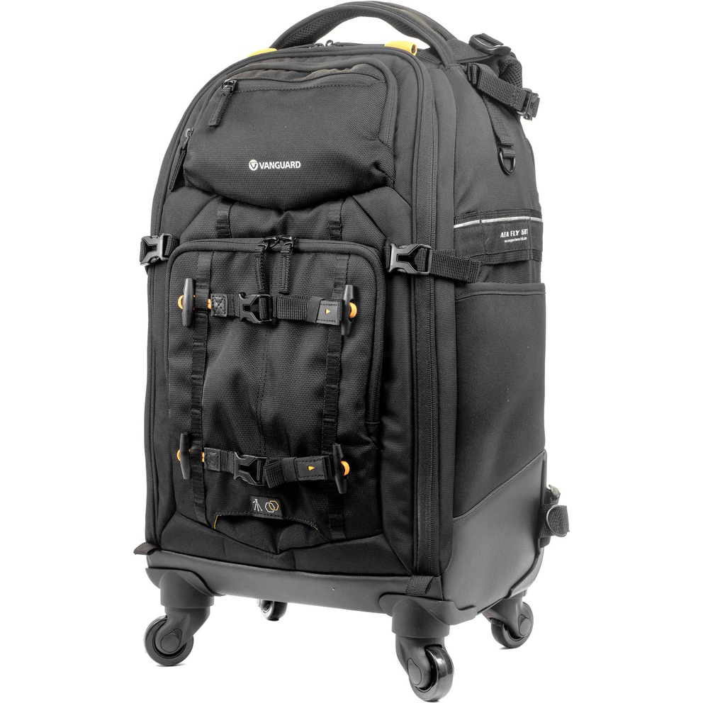 Transport, store, and protect two pro DSLRs, six lenses, a flash, and related accessories in the black Alta Fly 58T Roller Bag from Vanguard. This versatile bag has a removable insert with touch-fastening dividers for conversion to general use, and specialized dividers and straps for accommodating select drones. On the underside of the lid is a zippered pocket for a laptop up to 14″, and clear-mesh accessory pockets. For your iPad/tablet and smaller items there’s a zippered compartment with an organizer panel on the front exterior of the bag.