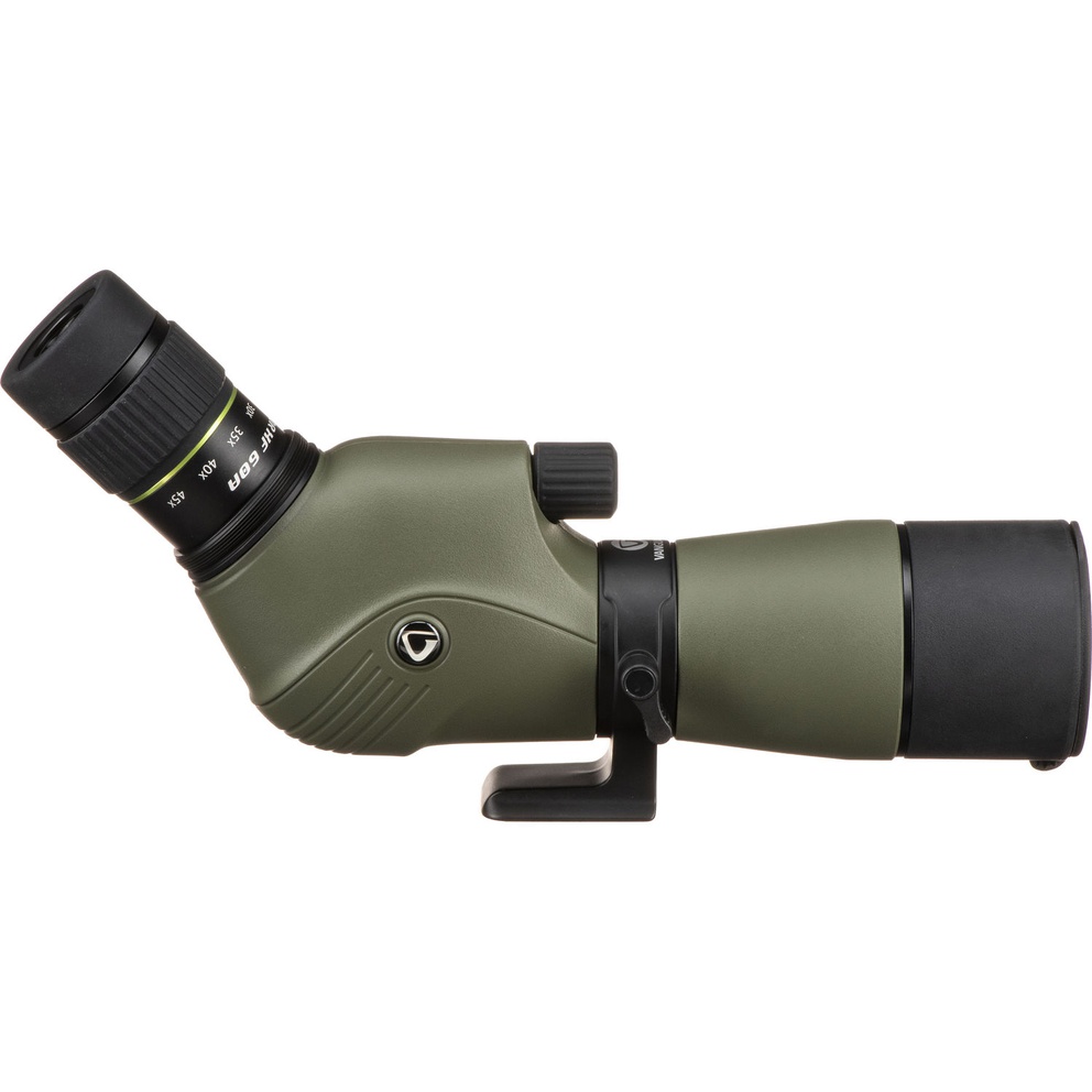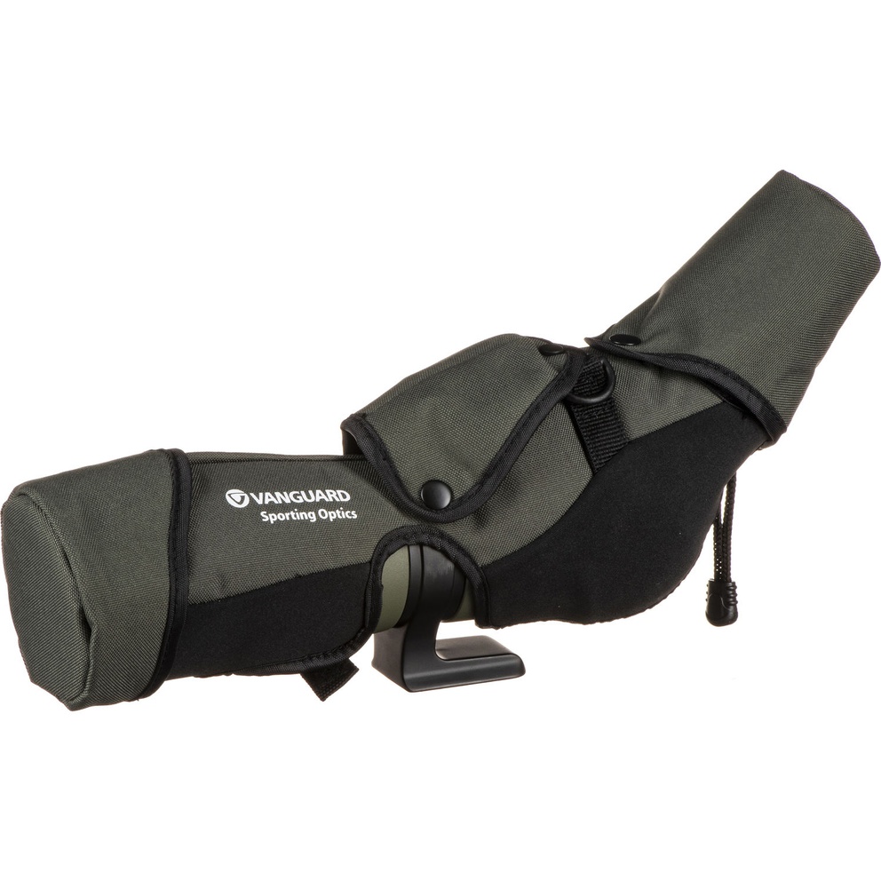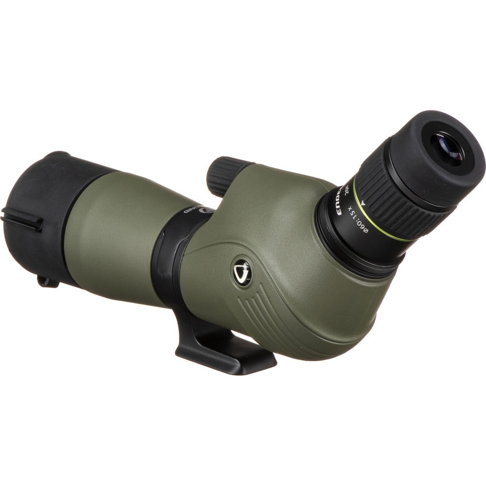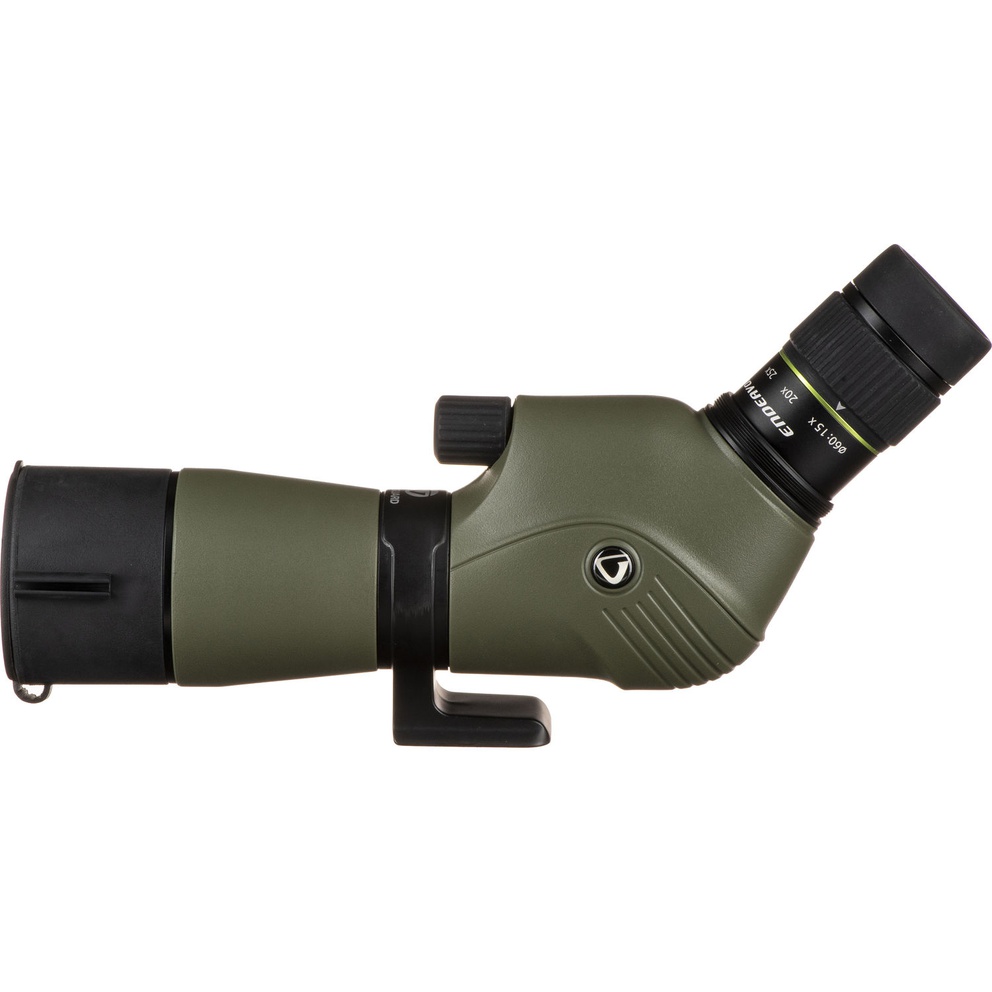 The Endeavor XF spotting scope boasts excellent optical viewing for nature enthusiasts and hunters. It features a rubber armored magnesium body and is waterproof submersible, nitrogen filled and fog proof. The lenses are all fully multi-coated to ensure optimum light transmission and feature a phase-coated BAK4 roof prism. The Endeavor XF 60A comes with a 60mm objective lens and angled eyepiece with 15-45x zoom magnification. It features an extendable rubber covered eyecup and boasts impressive eye relief even at the highest zoom settings. It also provides a very impressive field of view. A built-in sunshield is included to eliminate glare in direct sunlight and it includes a padded raincoat with sling for carry and protection. Endeavor XF is equipped with a large smooth focusing wheel for quick focusing adjustments. The Endeavor XF mounts directly to Vanguard tripod heads (and others) that are equipped with the universal mounting plate without the use of a quick shoe. The tripod mount on the angled scope rotates to give optimum viewing angles in a variety of situations such as bench shooting and use witha a window mount.