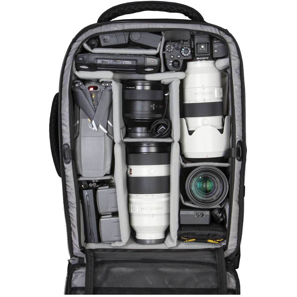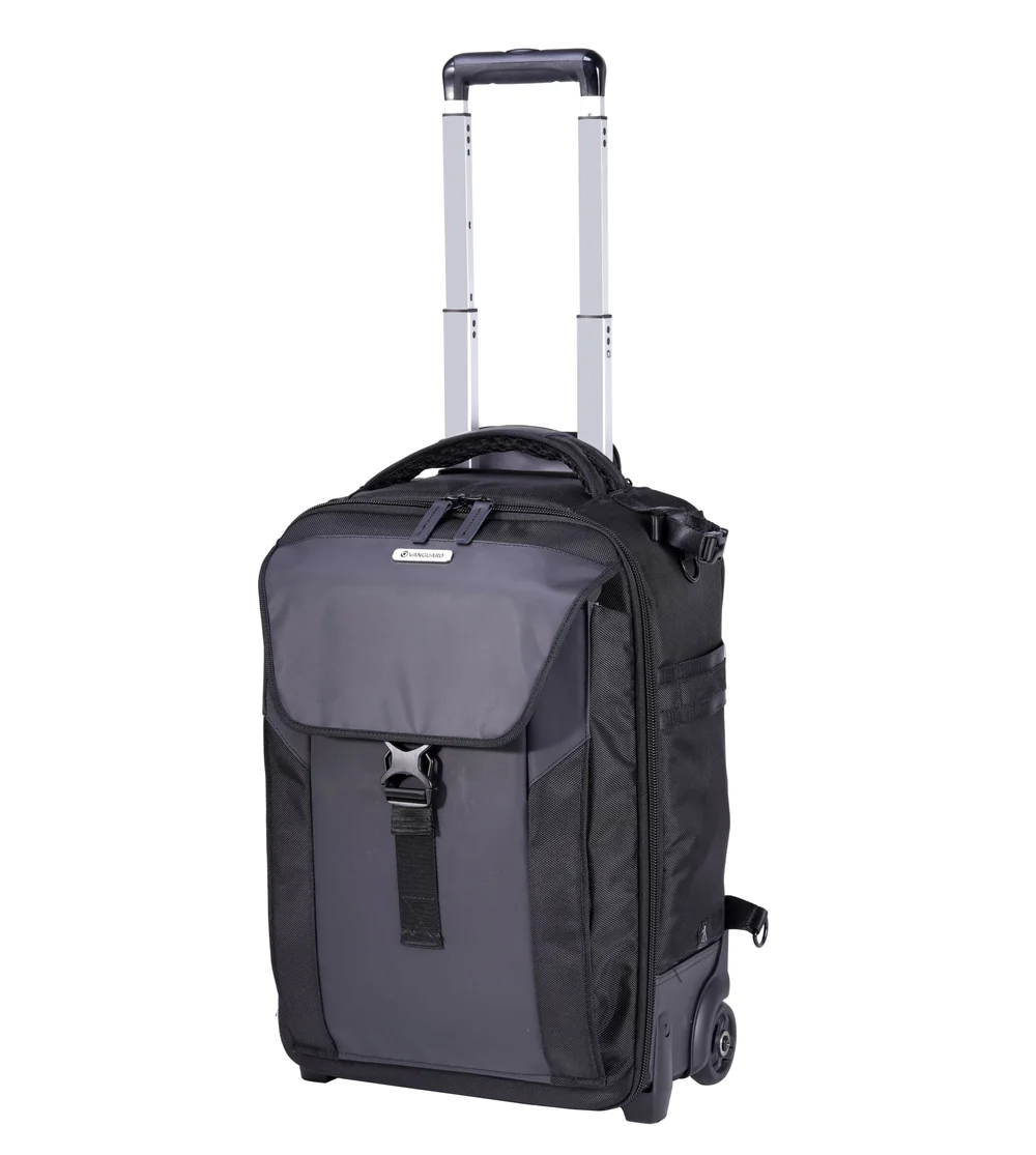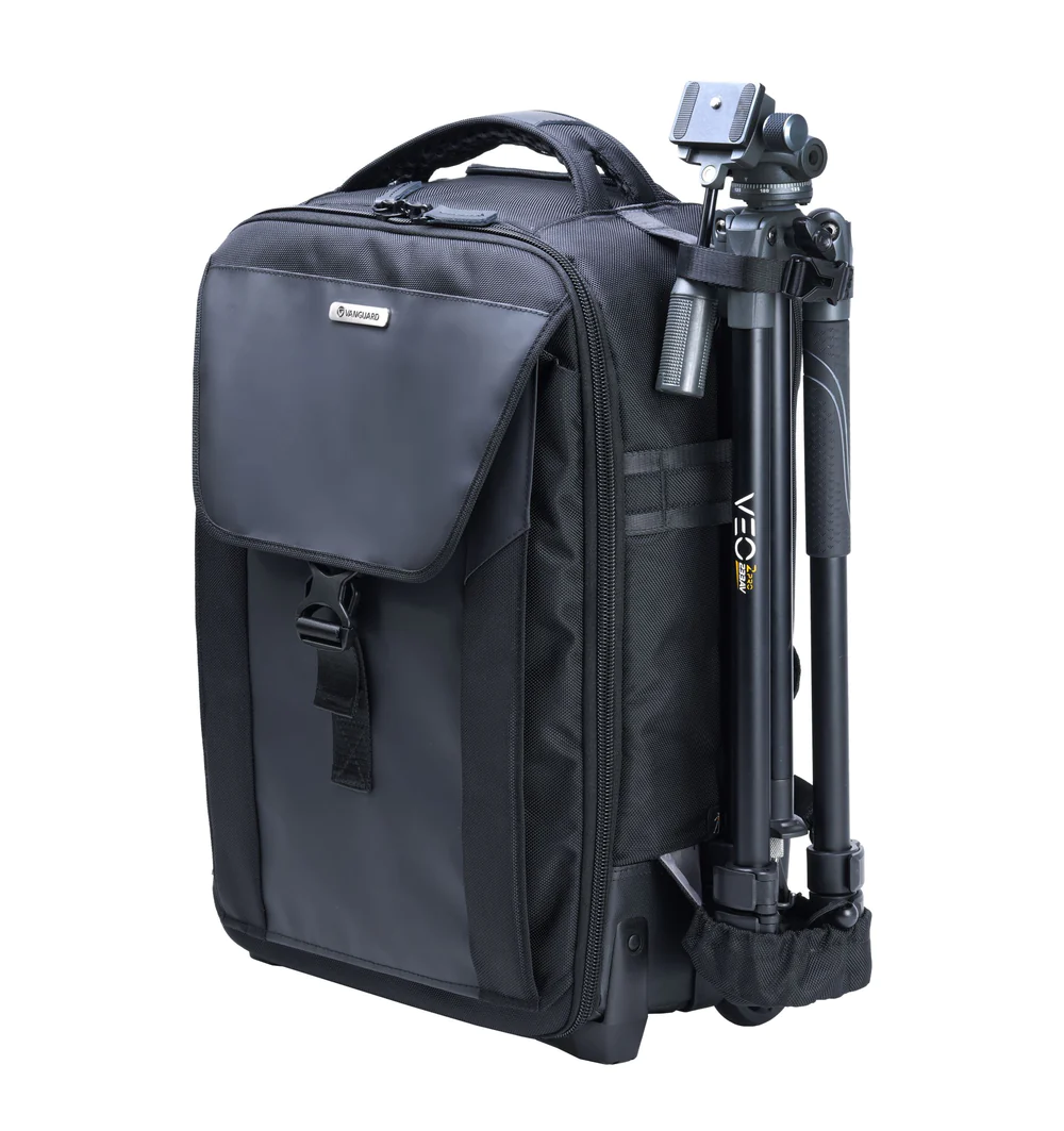 Store, transport, and protect up to three Pro DSLR/mirrorless cameras (one with an attached 400mm f/2.8 lens), six to seven lenses, a flash, and related accessories with the black Vanguard VEO SELECT 59T GR Roller Case. This case features built-in wheels, room for a 17″ laptop and 9.7″ tablet, plus multiple pockets and organizers. Photographers will appreciate the removable interior divider, the tripod storage, and the included rain cover. Carry the case with the top handle, side handle, shoulder straps, waist belt, or roll it with the built-in wheels.