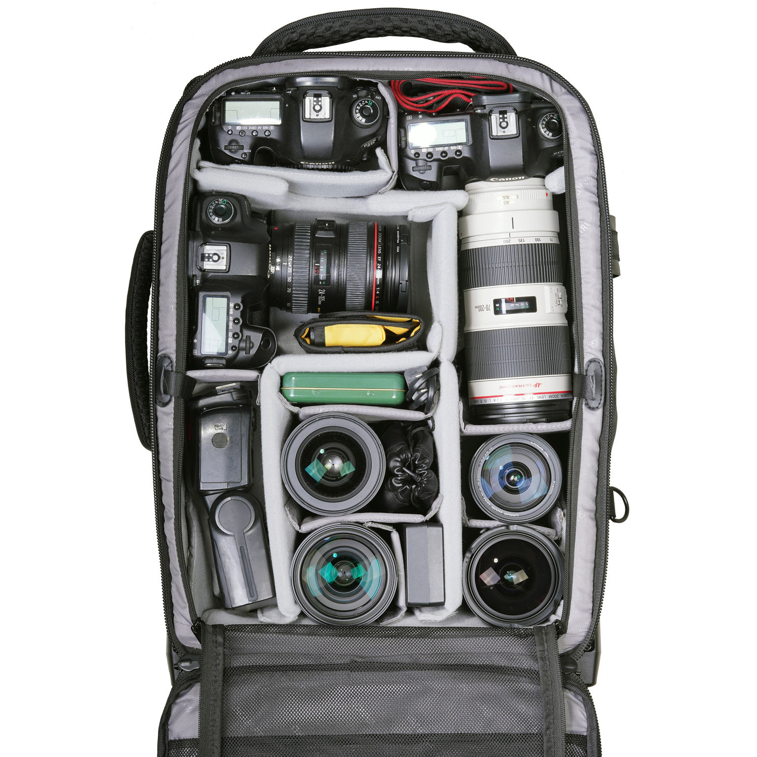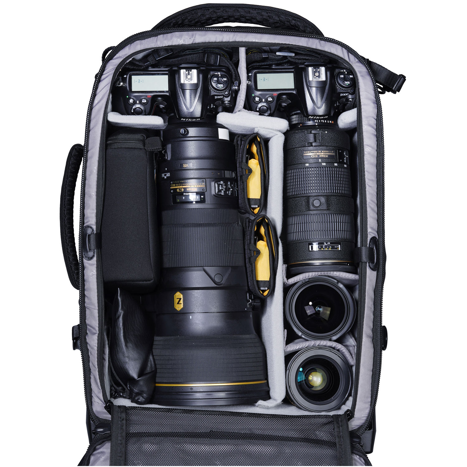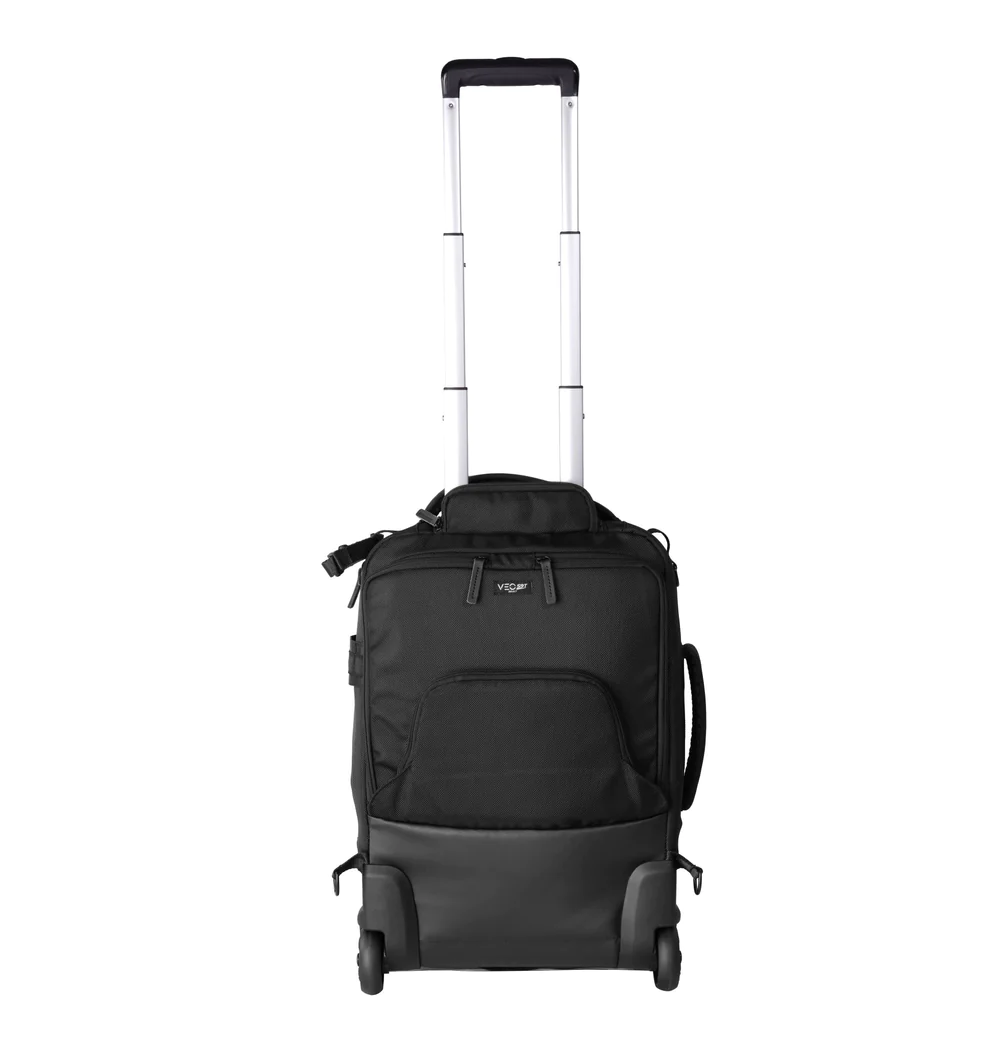 Store, transport, and protect up to three Pro DSLR/mirrorless cameras (one with an attached 400mm f/2.8 lens), six to seven lenses, a flash, and related accessories with the black Vanguard VEO SELECT 59T GR Roller Case. This case features built-in wheels, room for a 17″ laptop and 9.7″ tablet, plus multiple pockets and organizers. Photographers will appreciate the removable interior divider, the tripod storage, and the included rain cover. Carry the case with the top handle, side handle, shoulder straps, waist belt, or roll it with the built-in wheels.