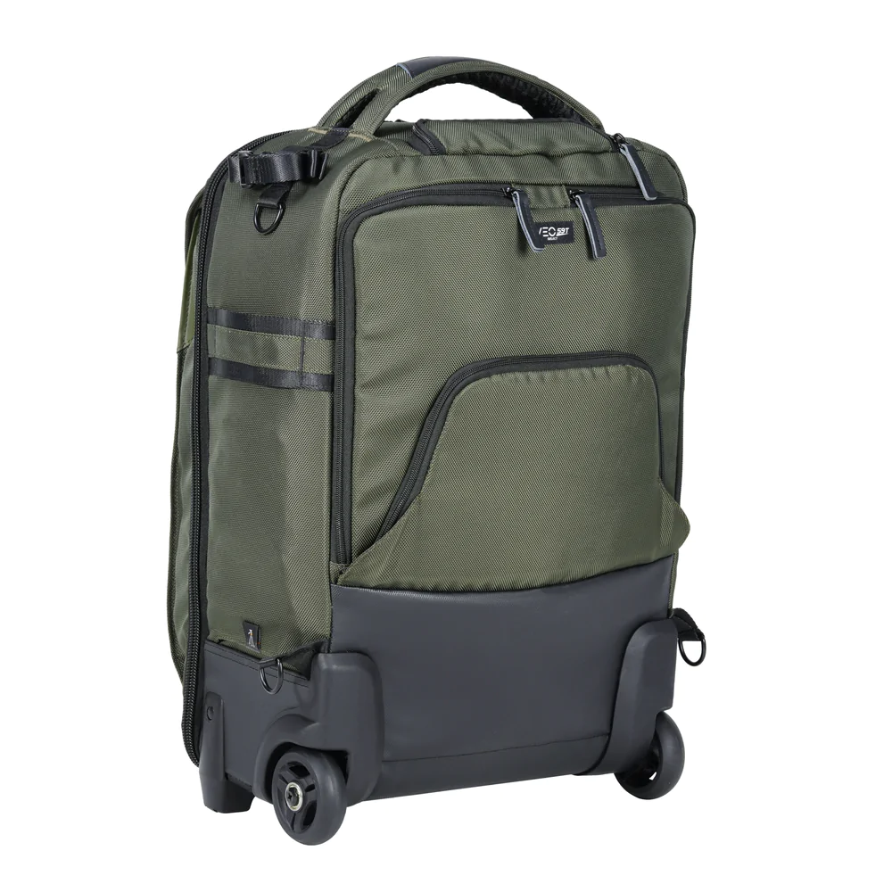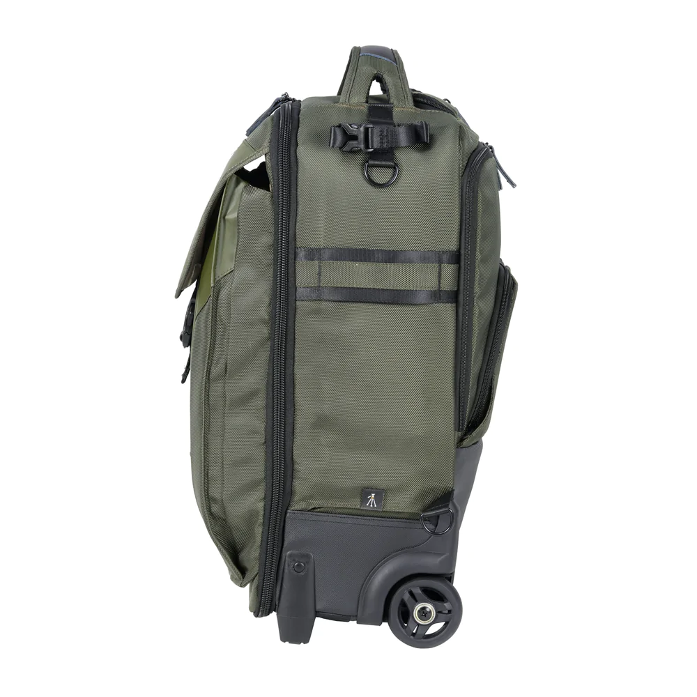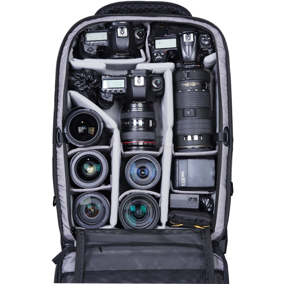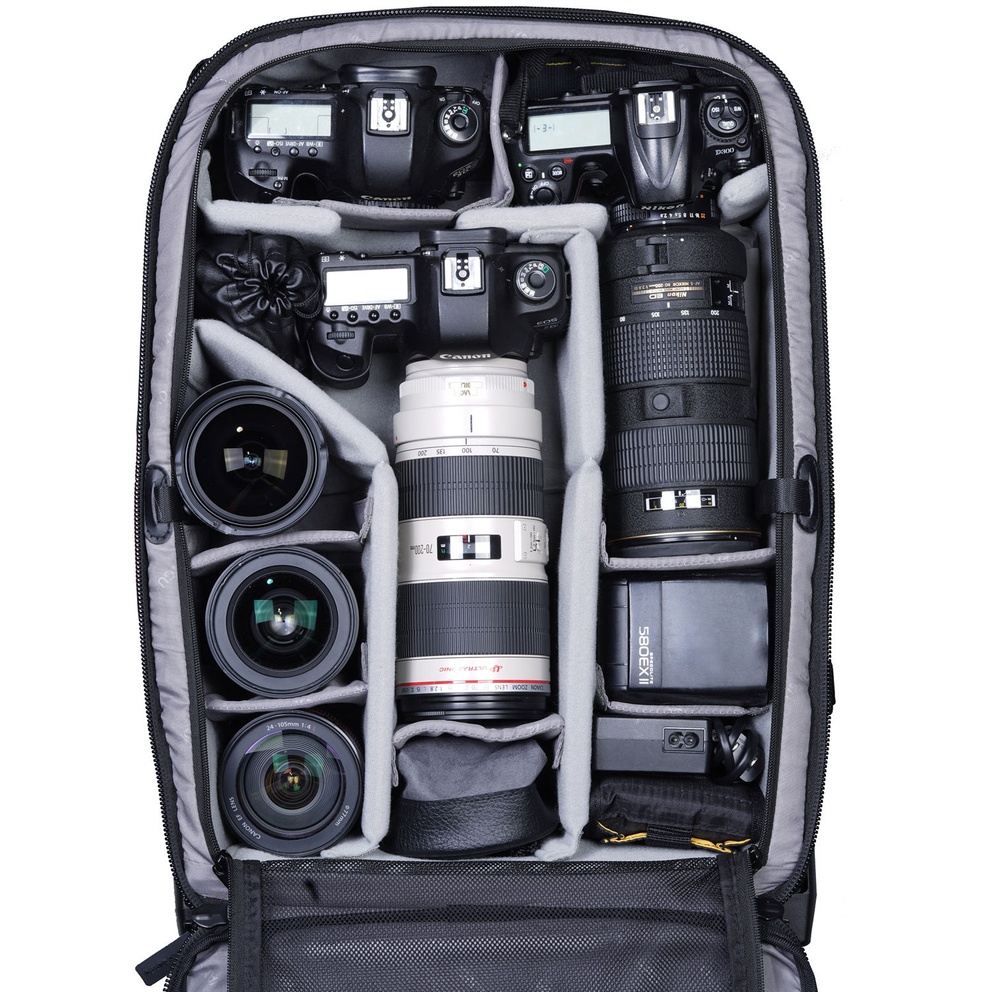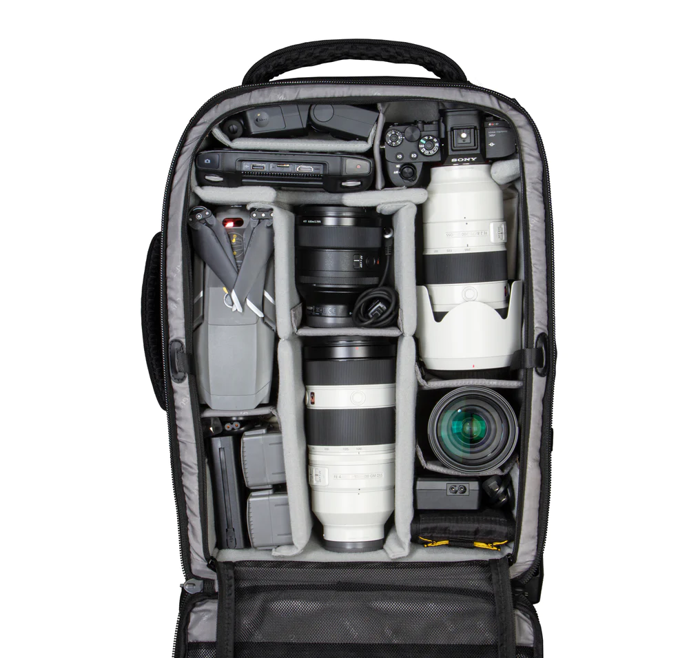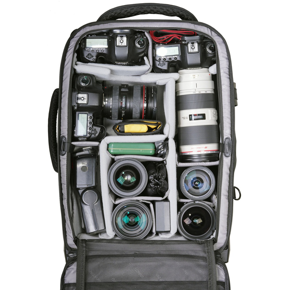 The VEO Select 59T BK Roller Case is a stylish 2-wheel carry-on trolley that converts to a backpack and packs a lot more than one would imagine. Having two wheels allows the interior to be slightly larger, which enables you to carry an additional kit. The bag will fit 2-3 Pro DSLR/mirrorless cameras with grip(s), 6-7 lenses (up to 400mm f/2.8), a flash unit, a 17″ laptop plus a 9.7” tablet, a tripod, and multiple accessories such as memory cards, cables, batteries, and a charger.