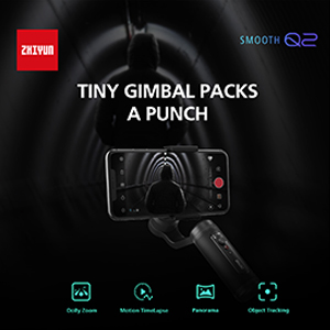 The Smooth-Q2 features object-tracking, motion-lapse, and time-lapse modes, and for the vloggers and selfie-takers, it switches quickly into vertical mode. The Smooth-Q2 offers 360° pan, 305° tilt, and 265° roll rotation, and provides 360° barrel roll shots in vortex mode. The gimbal can remotely control your iOS or Android smartphone’s camera via Bluetooth 5.0 to take photos and record videos without using the ZY Play app. The app can be used to transfer and edit video, change modes and settings, and upgrade the gimbal’s firmware.